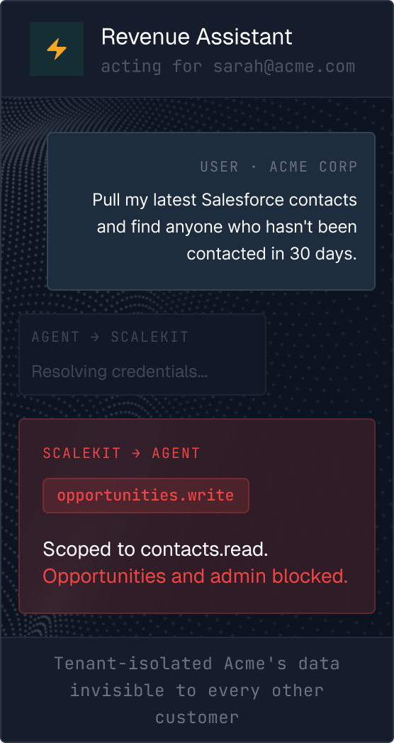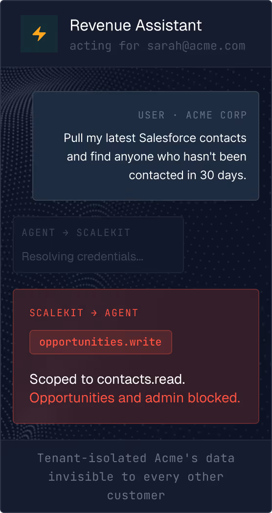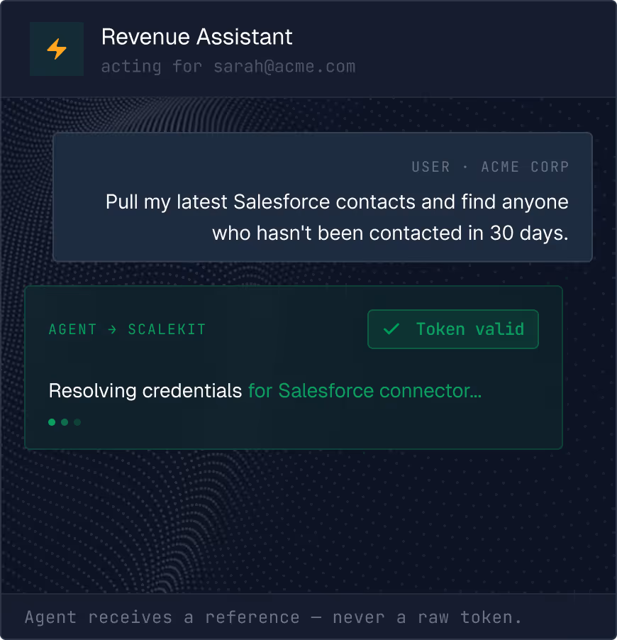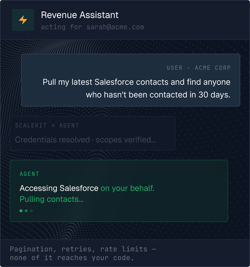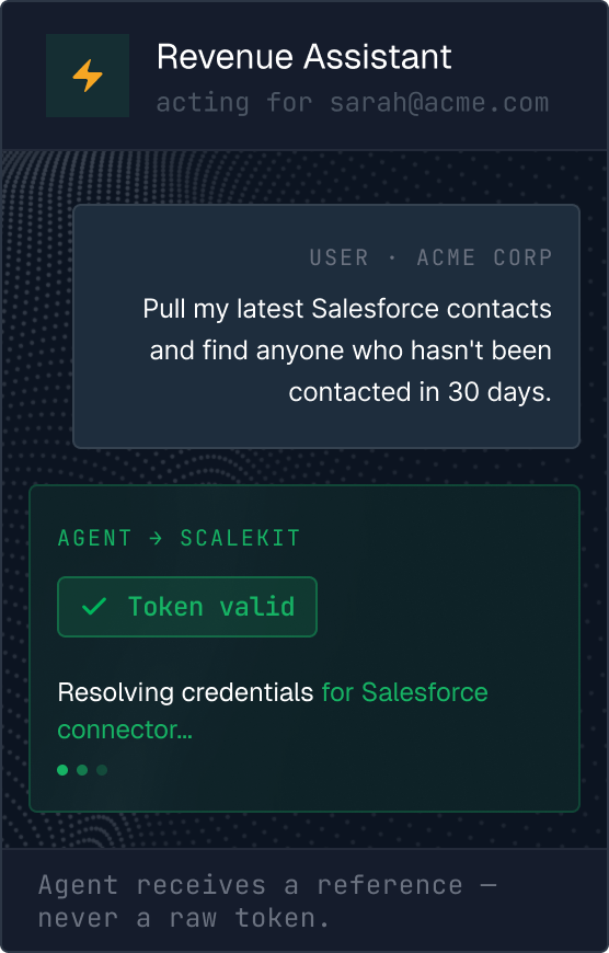 Scalekit gives your agents authenticated and scoped access to third-party apps — Gmail, Slack, Salesforce, GitHub, Notion, and 100+ more. Scalekit handles the delegated OAuth flow, token storage, and the tool call on behalf of your user. No service accounts, or hardcoded credentials.