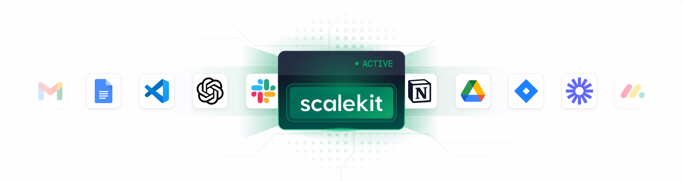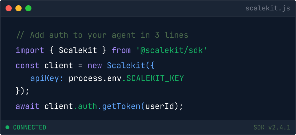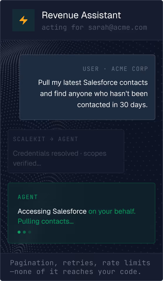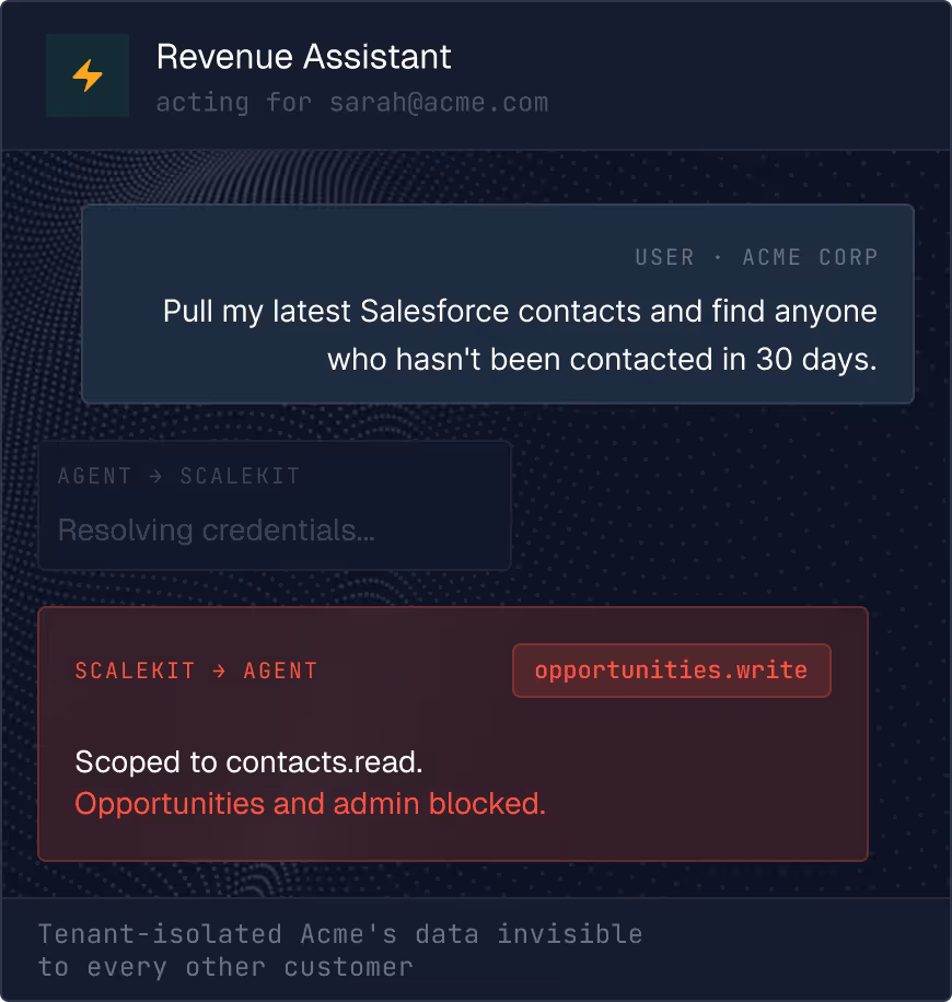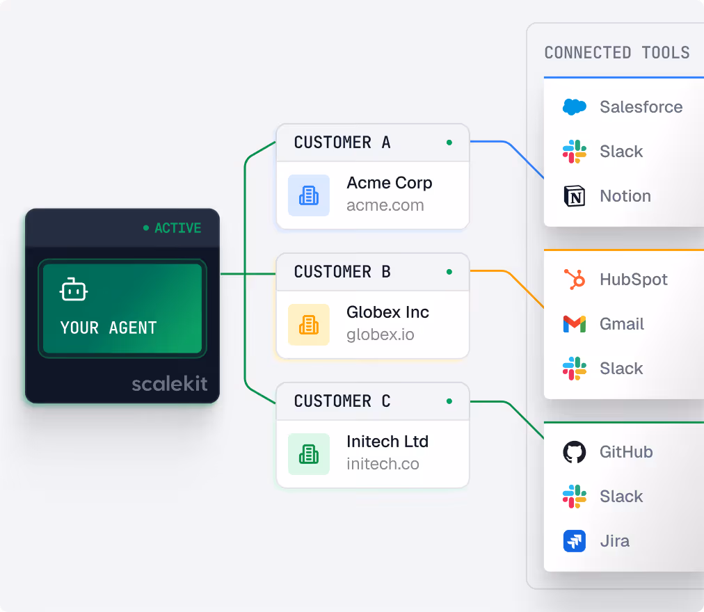 Scalekit gives your agents authenticated and scoped access to third-party apps — Gmail, Slack, Salesforce, GitHub, Notion, and 100+ more. Scalekit handles the delegated OAuth flow, token storage, and the tool call on behalf of your user. No service accounts, or hardcoded credentials.