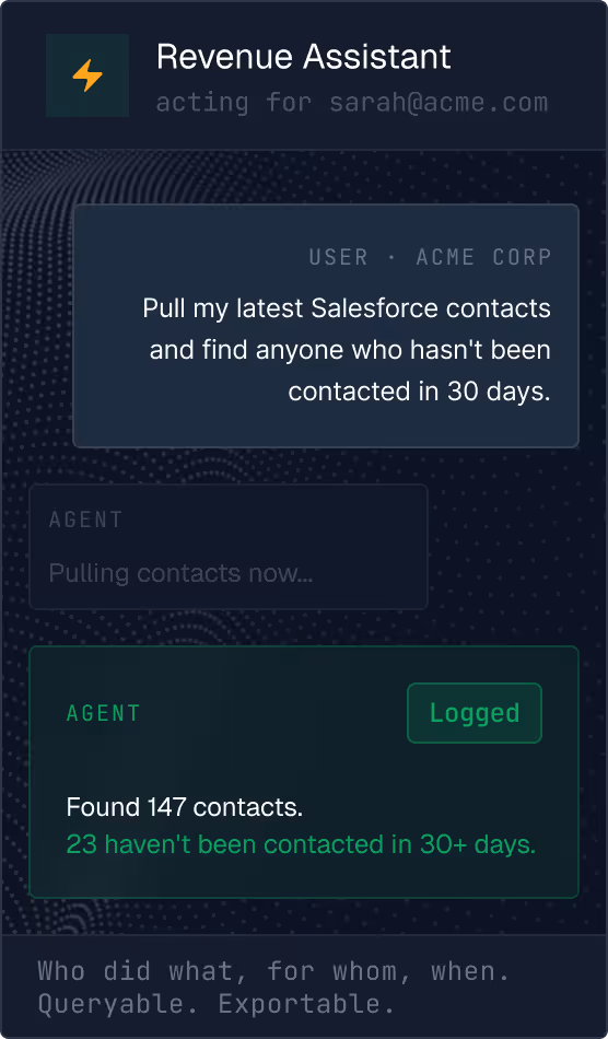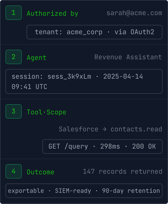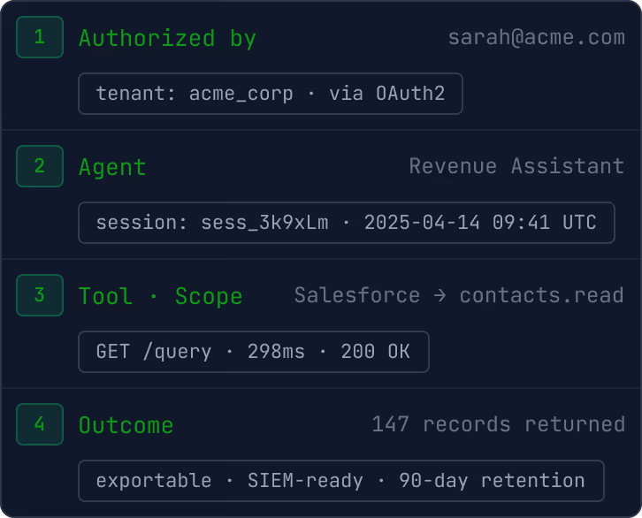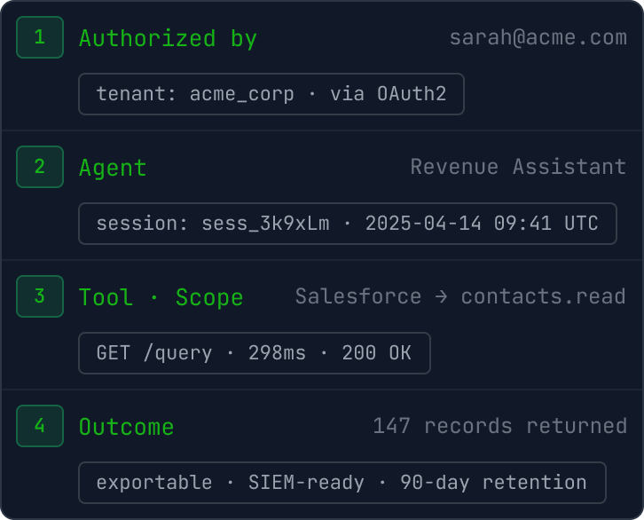 Who authorized, which agent, which tool, what scope, what came back. Queryable, exportable to Datadog, Splunk, or any SIEM. 90-day retention by default.