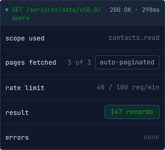 Pagination, rate limits, retries, errors. All handled before the response reaches your agent.