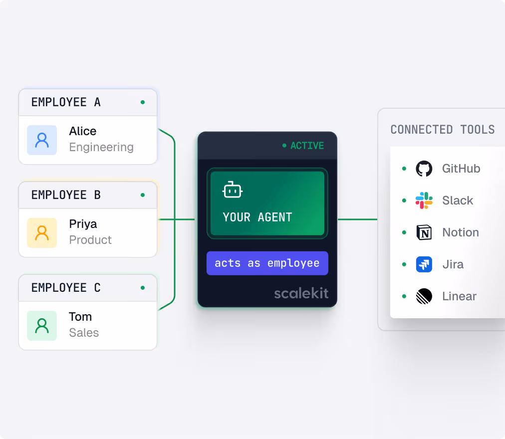 When a user authorizes a connector, Scalekit creates a connected account — a per-user token store tied to that user's identity. Every tool call your agent makes uses that specific user's credentials. Actions appear as that user in the target app, and access is limited to exactly what they've authorized.