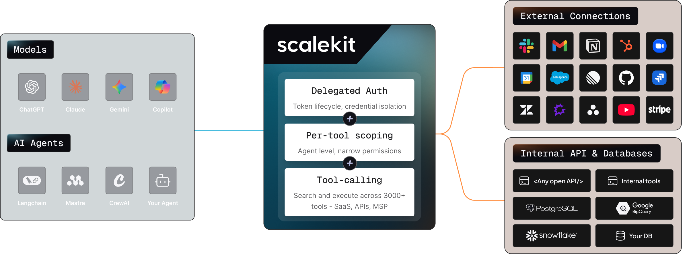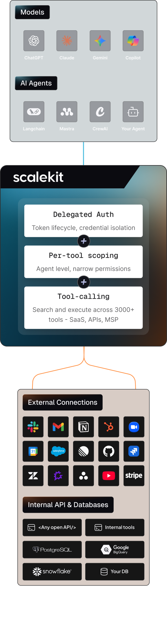 Delegated identity, scoped credentials, and token lifecycle for every tool your agents touch — so you ship actions, not auth plumbing.