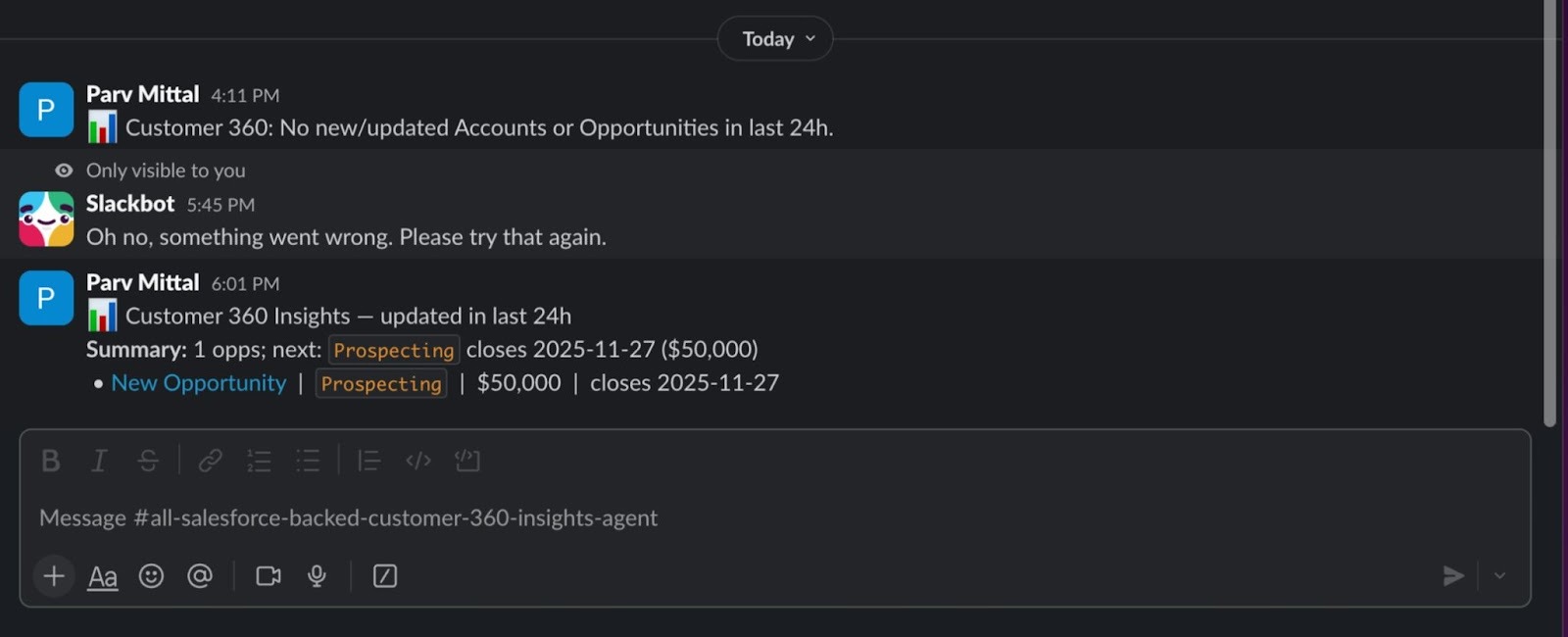 The Customer 360 Insights Agent transforms passive Salesforce data into actionable Slack signals. You’ve seen how it: