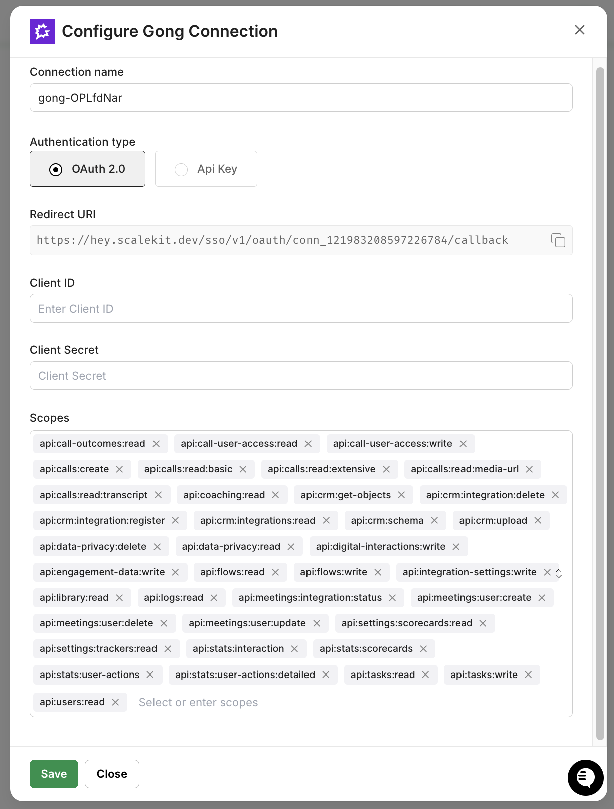 Navigate to Agent Kit → Connections and add a new connection for Gong. Before authorizing, make sure your Gong workspace admin account has the following scopes enabled: api:calls:read, api:calls:transcript:read, and api:users:read. These are required for the agent to pull calls, transcripts, and attendee data.