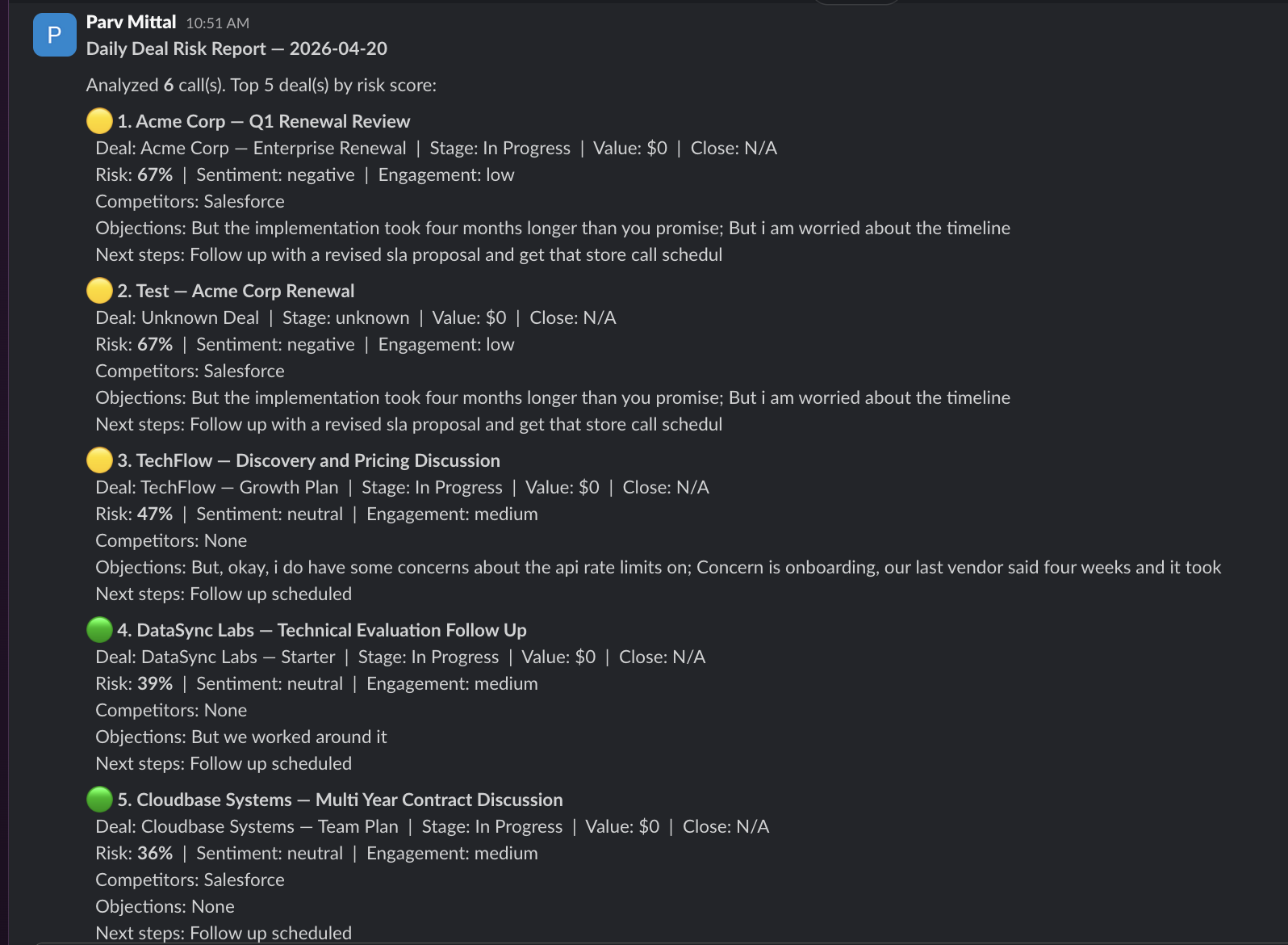 Every morning, it runs the same cycle: fetch calls, analyze transcripts, match to CRM, score risk, and post to Slack. A sales leader opens Slack and sees a prioritized brief with the most at-risk deals at the top, complete with deal stage and close date from Attio, specific objections and competitor mentions pulled from the Gong transcript, and next steps sourced from what was actually discussed on the call.