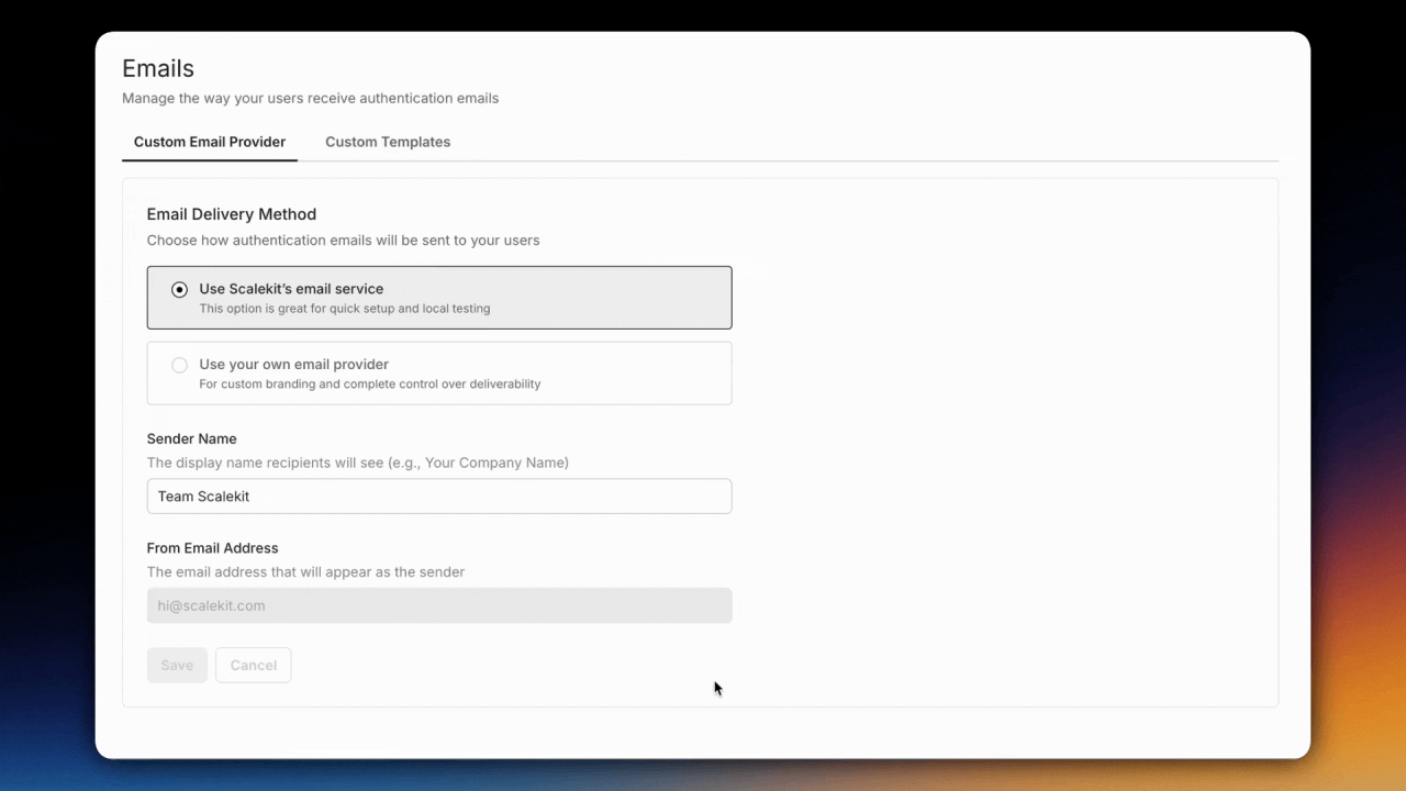 Scalekit provides email delivery out of the box, but you can integrate your own email provider for complete control over sender domains, deliverability, and compliance. Use your own SMTP provider—SendGrid, Amazon SES, Postmark, or any SMTP service.