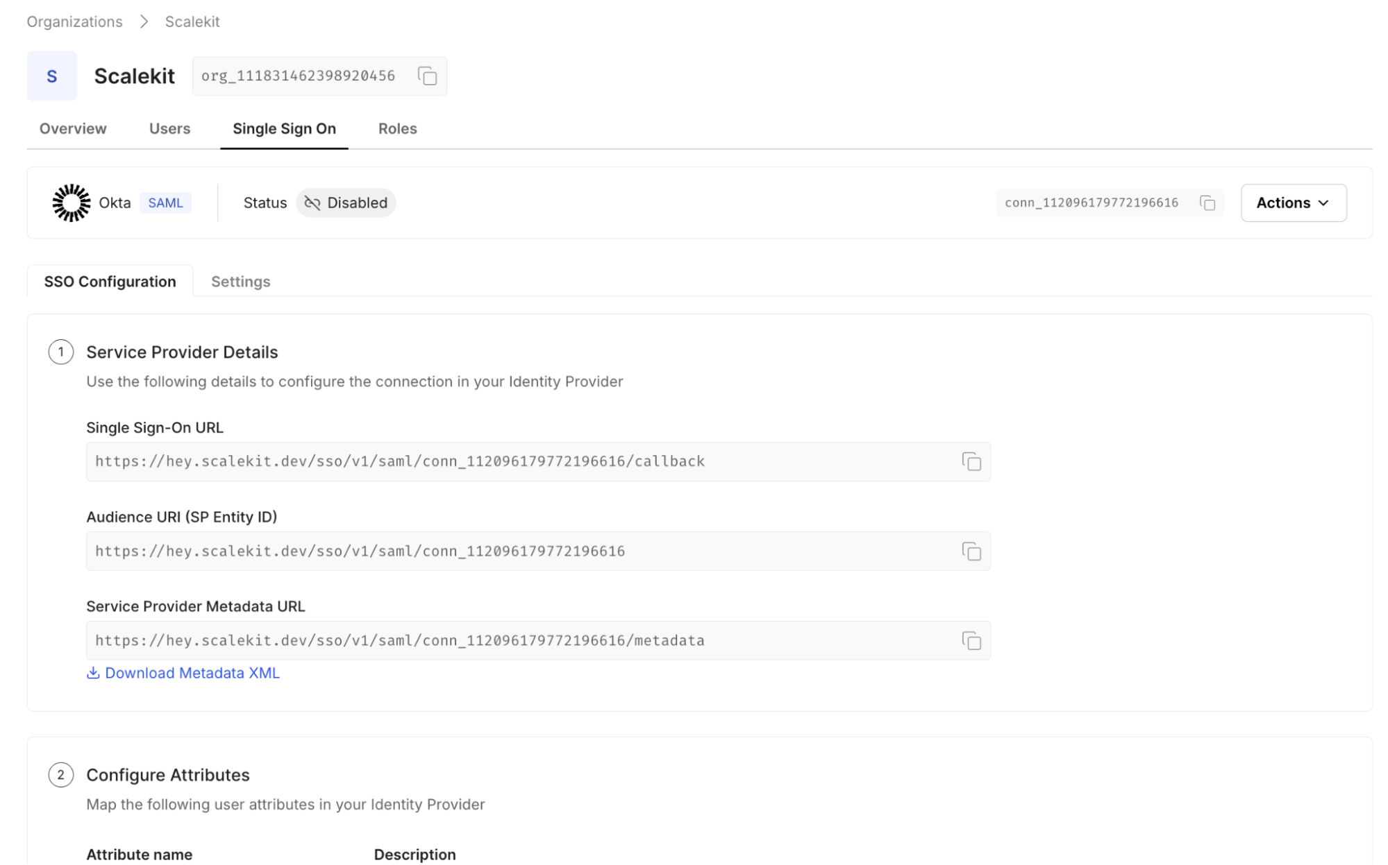 With Scalekit in place, enterprise SSO setup moves out of your Auth0 tenant and into a customer-scoped configuration model. Unlike Auth0 Enterprise Connections, which are created per customer inside your tenant, Scalekit centralizes the upstream trust and isolates enterprise variability outside your core authentication layer.