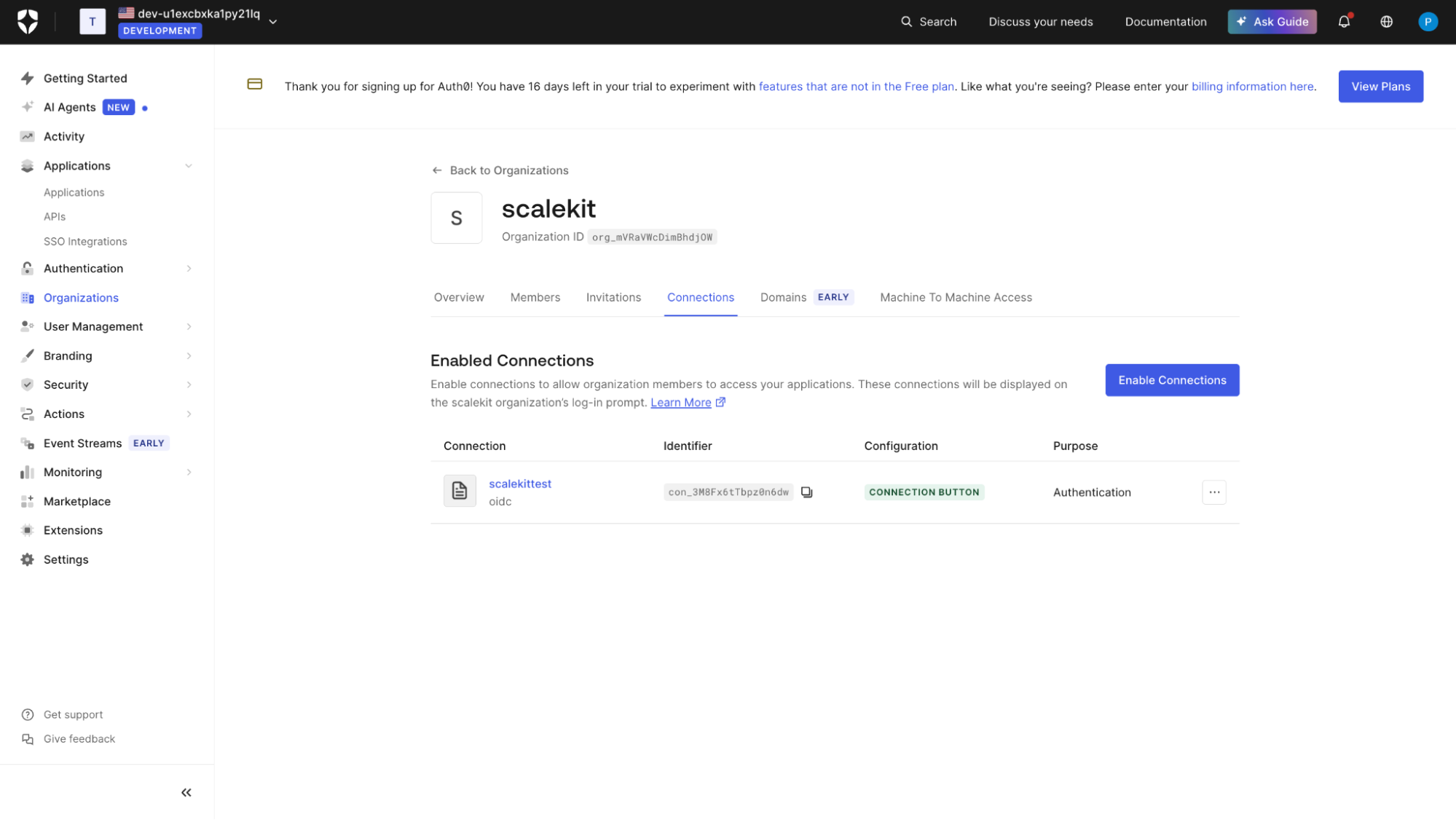 Unlike Auth0 Enterprise Connections, these IdPs are isolated to the specific customer account within Scalekit, not to your Auth0 tenant.