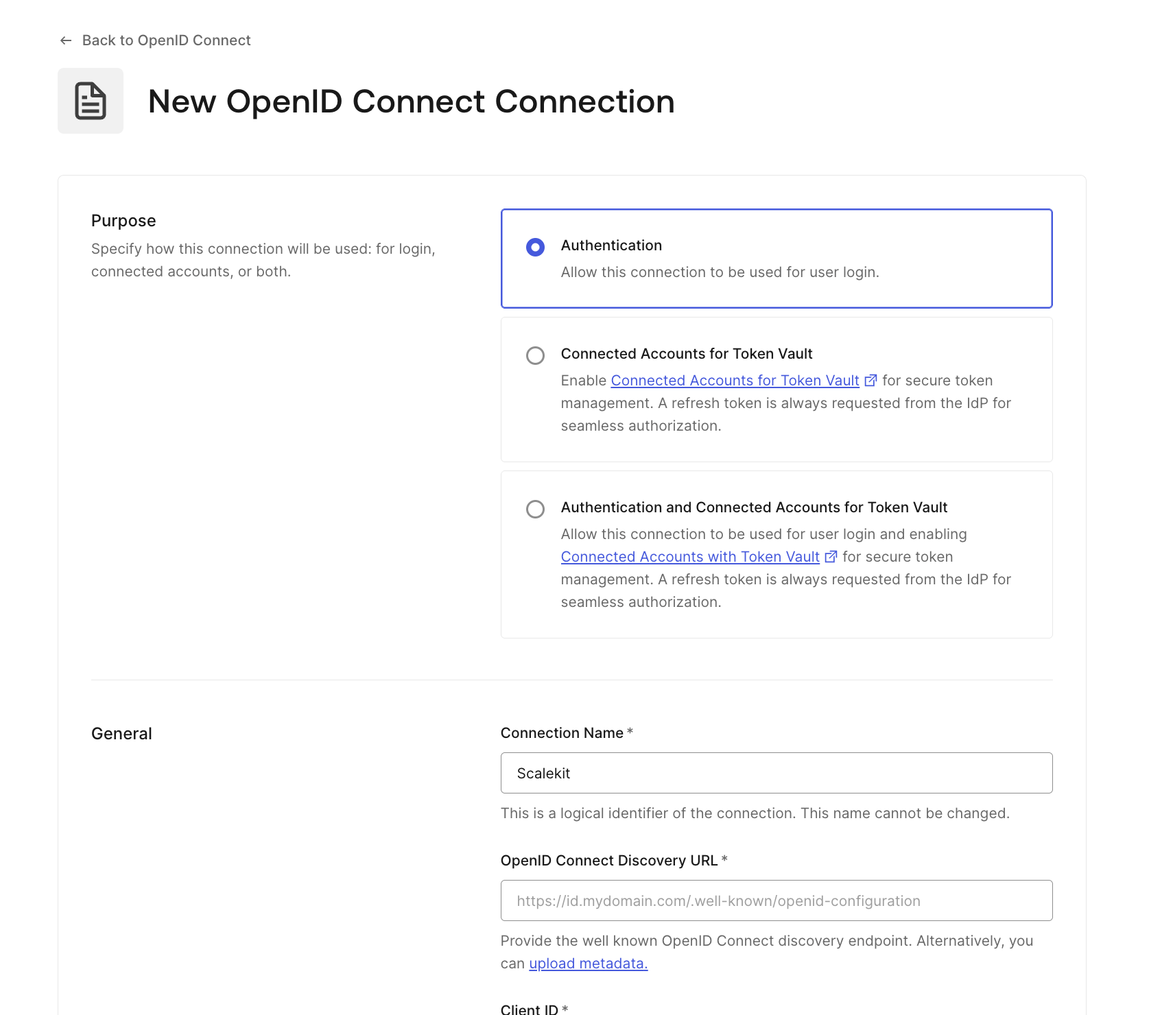 Auth0 is configured to trust Scalekit as an external OIDC identity provider. This creates a single upstream connection that Auth0 will use for all enterprise SSO traffic.