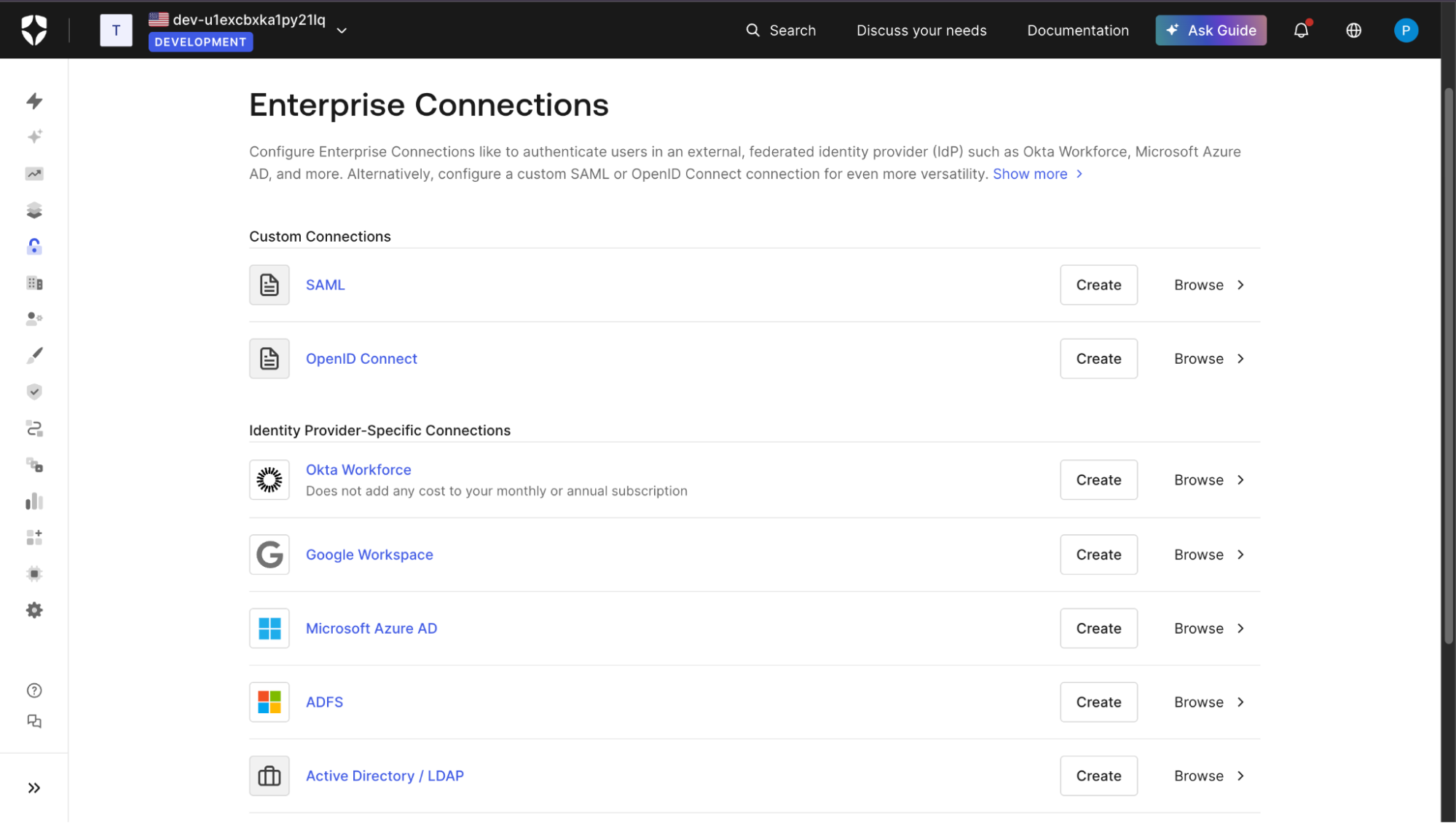 Auth0 implements enterprise SSO through a construct called Enterprise Connections. Each enterprise customer is configured as a distinct SAML or OIDC connection inside your Auth0 tenant, representing that customer’s identity provider, such as Okta or Microsoft Entra ID. There is no global “enable SSO” switch. Every customer integration is created, configured, and maintained individually.