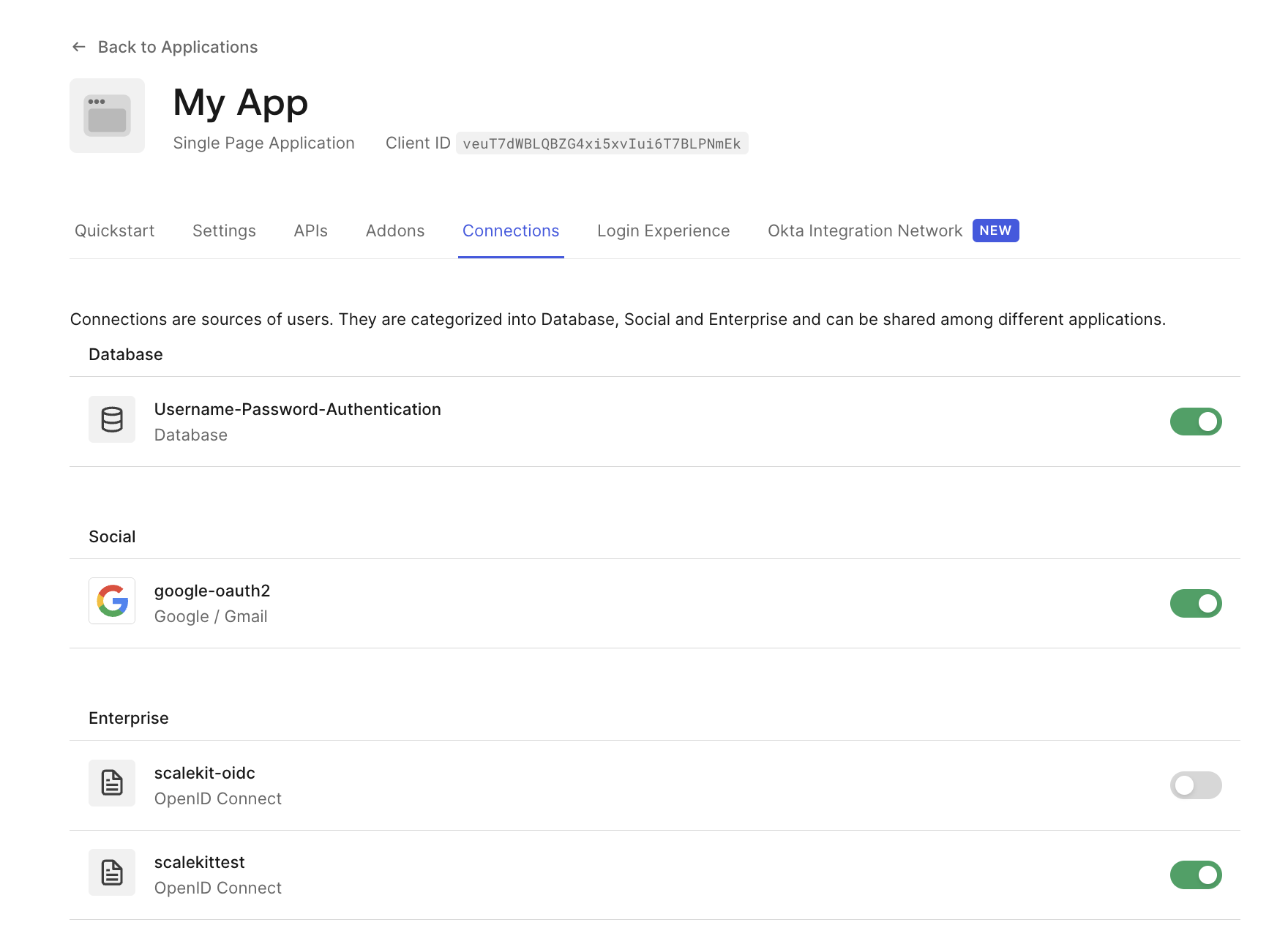 After configuration, the enterprise connection must be explicitly enabled for the Auth0 application that represents your B2B product. Without this step, the connection exists but cannot be used for login.