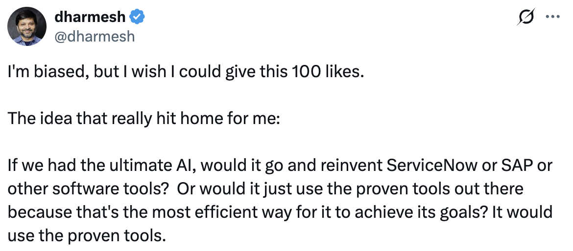 As Dharmesh points out, if you have a 200+ IQ human join your team and you ask them to summarise sales in Europe last quarter, you don't want them to start "vibe coding" their own CRM. You want them to access the system of record, the tool that was specifically built for that purpose.