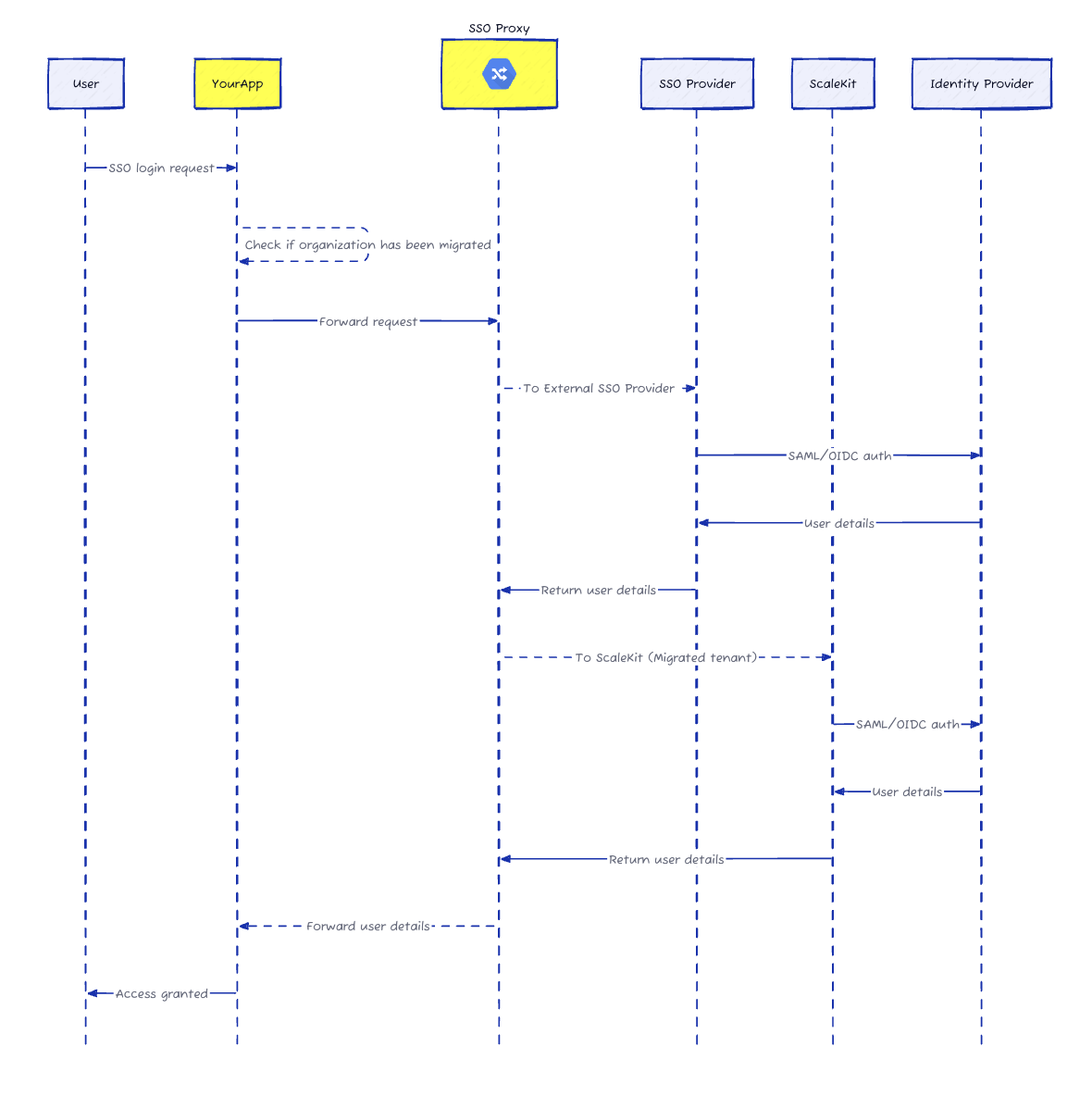 When a user initiates SSO login, the proxy routes migrated organizations to Scalekit and unmigrated ones to your existing provider. Users see no difference—same login flow, same experience.