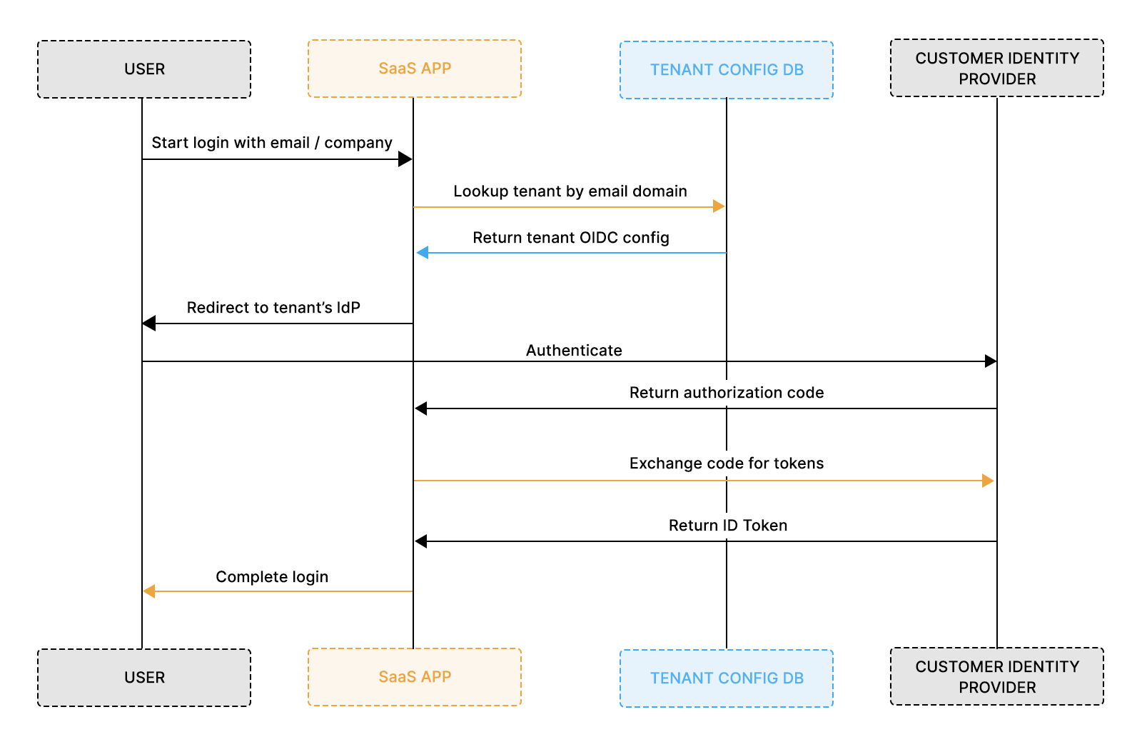 The Authorization Code Flow stays the same, but the endpoints used during the redirect must be selected per tenant. Each enterprise customer has a unique issuer, authorization endpoint, token endpoint, and JWKS URL, so the redirect cannot use a single global configuration.