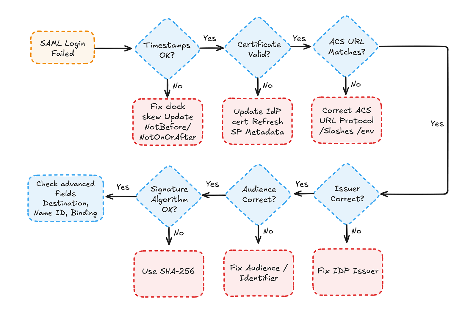 The checklist below provides a priority-ordered triage sequence used across major SSO platforms. Engineers can paste it directly into runbooks or incident channels. It isolates the highest-frequency failures first, shaving minutes off every debugging cycle. Combined with the decision diagram included below, it creates a simple mental model for rapidly eliminating the most likely causes of failure.
