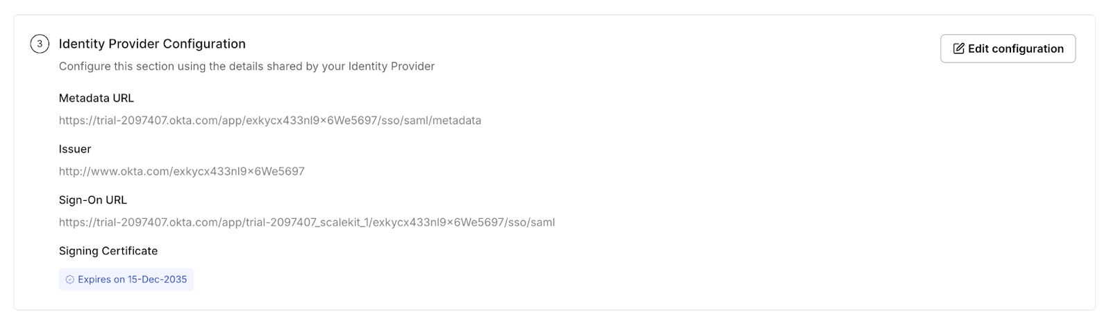 Scalekit helps by displaying the active IdP EntityID directly in the Identity Provider Configuration and highlighting mismatched Issuer values in Authentication Logs. You can refer to the debugging section below to see exactly where these trust fields appear.