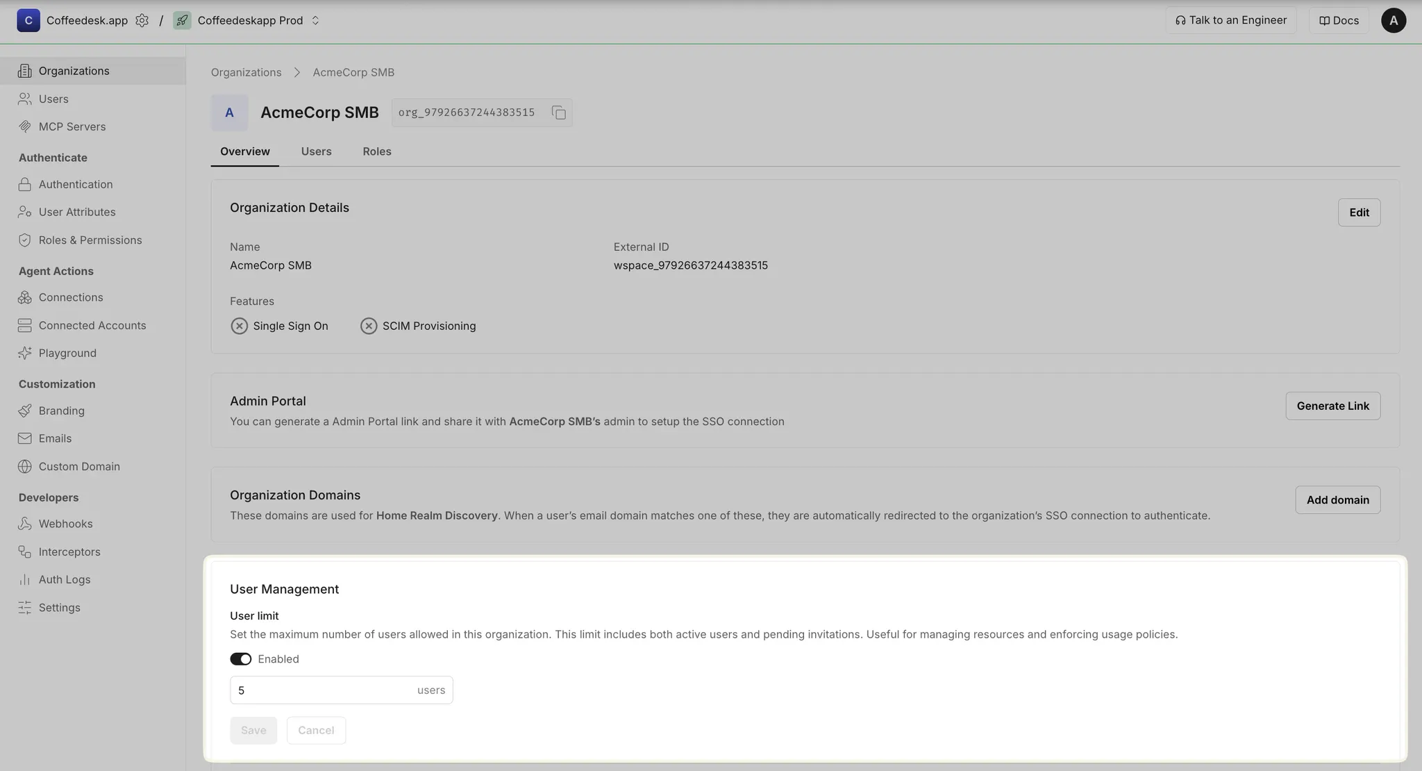 Seat caps can now be enforced at the organization level. This is useful when organizations map to departments, or when your plans have per-org seat limits. It gives product teams predictable control over usage and supports tiered pricing models cleanly.
