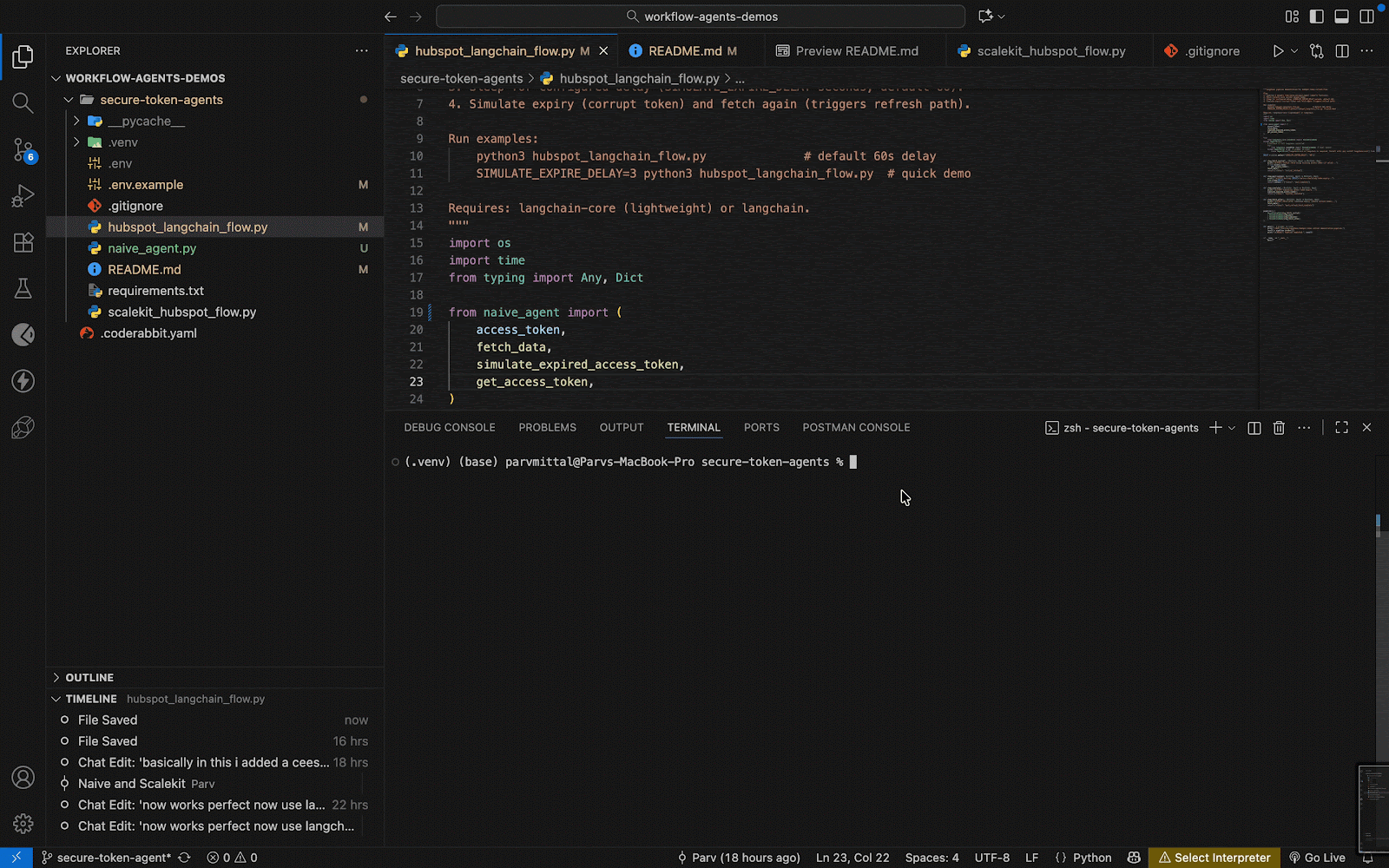 For the HubSpot example in this post, you do not need LangChain at all. Scalekit already handles authentication, short-lived tokens, rotation, and retries, so the simplest and safest path is to call the connector directly and keep your script focused on business logic. Your scalekit_hubspot_flow.py does exactly that: initialize ScalekitConnector, pass the SCALEKIT_IDENTIFIER, and fetch contacts through the managed HubSpot tool. No =secrets live in .env beyond Scalekit app credentials, and no token parsing or refresh code appears in your agent.