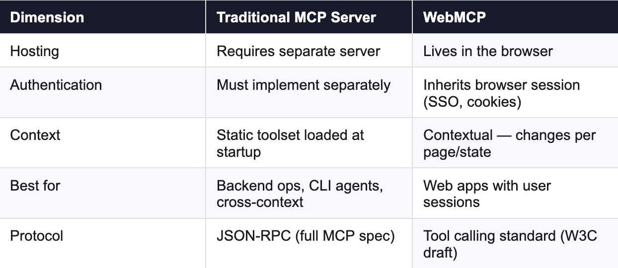 If you're already thinking about AI-readiness for your product, you may have started with a traditional MCP server. WebMCP doesn't replace that — but understanding when each is the right tool matters.