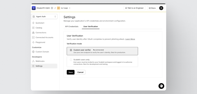 Before an agent is allowed to act on someone's behalf, it requires a two-point identity match: the OAuth consent, plus confirmation that the person who clicked is the same person your app already has a session for. Even if an attacker completes OAuth on a forwarded link, the verify call fails. Identity comes from your session — not from anything in the URL.
