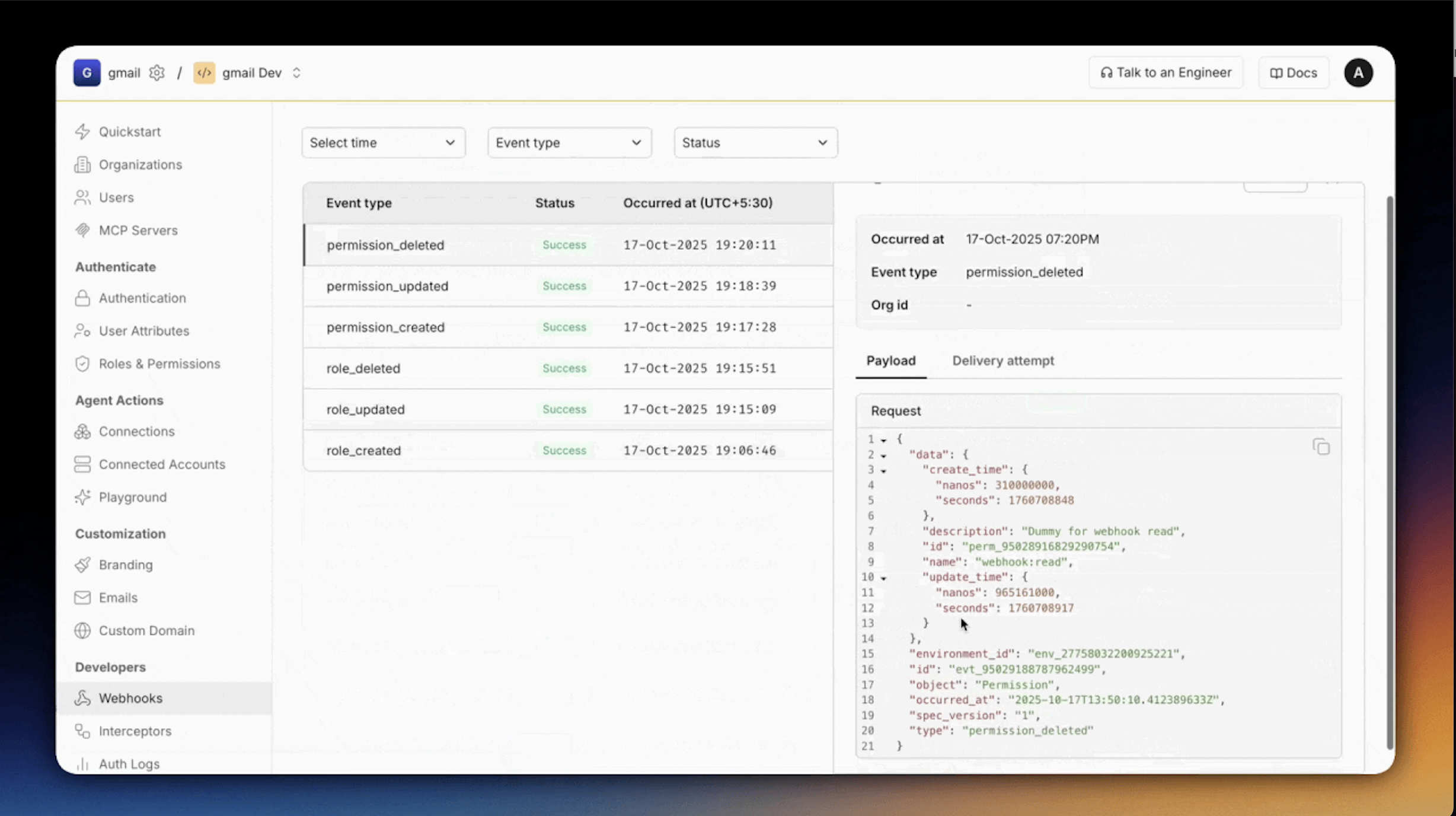 Scalekit webhooks now deliver real-time events for users, organizations, and sessions—enabling downstream automations the moment identity changes occur. Trigger provisioning workflows, audit pipelines, notifications, or custom business logic instantly, without polling or delays.
