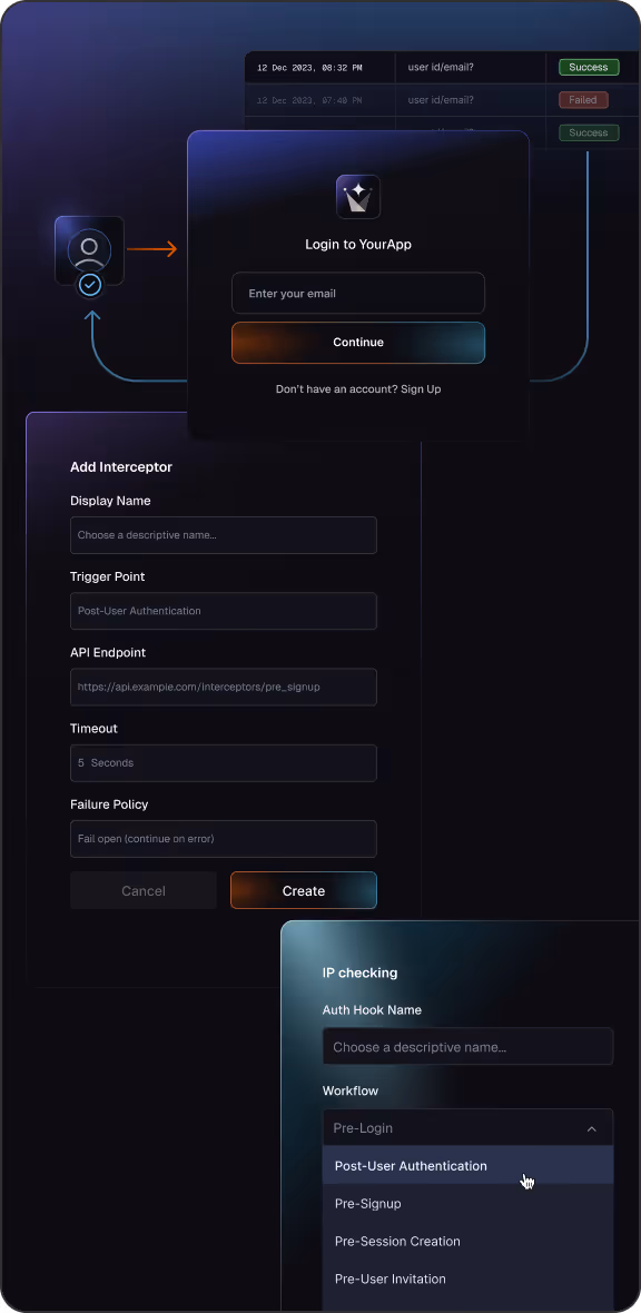 Enforce auth policies, integrate events in real-time and capture complete logs —no custom code. All powered by in-built Interceptors, Webhooks, and Auth Logs