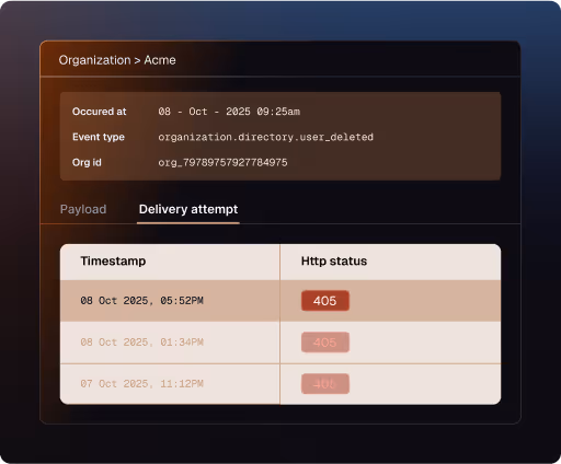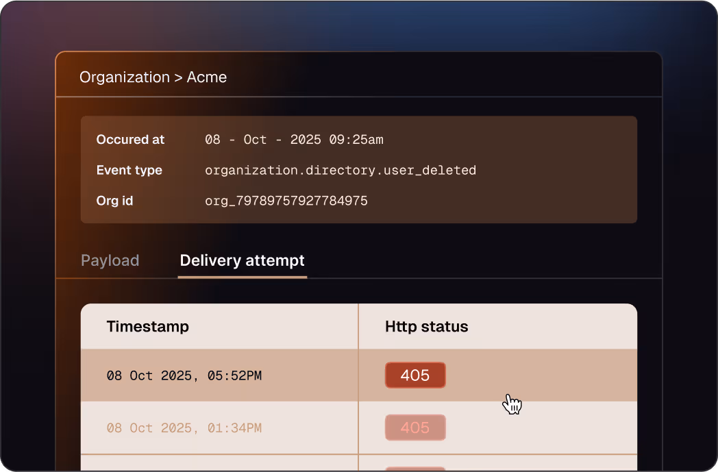 Deliver every auth event: sign-in, signup, revocation, or deletion, in real time with guaranteed delivery, retries, and signature verification